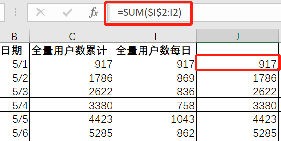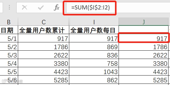 PS:这里插一句题外话,上文是已知累计求每日的数,是用当日减前日,若已知每日求累计,如何求?我们发现用当日的数加上前日的数好像不对了,因为当公式下拉的时候,得到的每一项的值都是当日加前日,就只有两个数据相加,实际上我需要的是当日以前所有的数据相加,这里就要用到sum函数。Sum($I$2:I2),什么意思呢?$I$2是被绝对引用了,不能变,能变的是没有被引用的I2,第一个单元格不明显,那我们看第三个单元格,从I2加到I4,明白了吧。