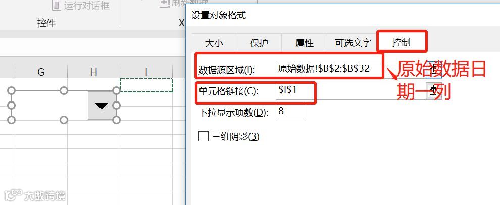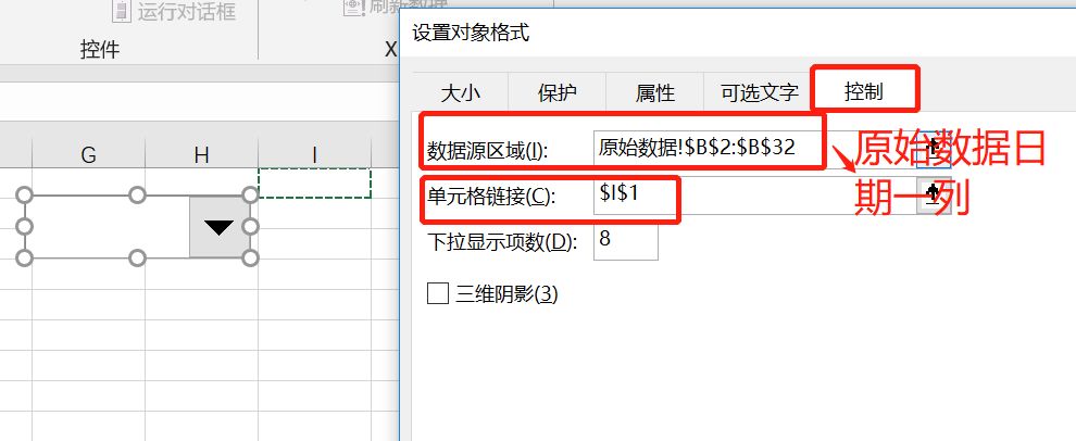 数据源表太宽了,我们新建一张数据过度表,点击开发工具——插入——组合框。当鼠标变为十字的时候在Excel空白区画一个大小得宜的框,右键设置控件格式,在数据源区域选择原始数据中的日期一列,单元格链接随便选一个空白区域,下拉显示项数默认。这样我下拉框选择一个日期,如5月1日,在I1单元格就会出现日期对于的天数,1。