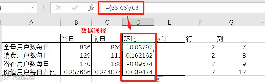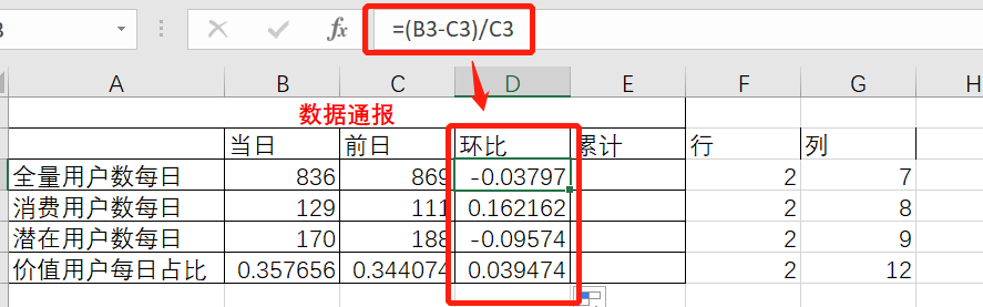 接下来求环比,今天的环比=(今天-昨天)/昨天。另外说一下,环比和同比的区别,举个列子,今天和昨天比是环比,今年的5月和4月比也是环比,但今年的5月和去年的5月就是同比,今年的今天和去年的今天是同比,明白意思了哈。