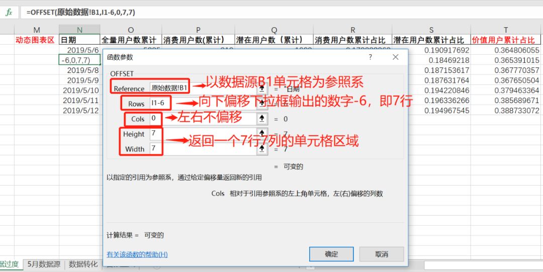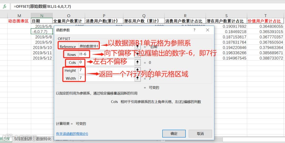 对自己要求高的人还想要动态地展示前7天的图表,这里用到offset函数,offset函数是以指定的引用为参照系,通过给定偏移量得到新的引用,返回的引用可以是一个单元格或区域。