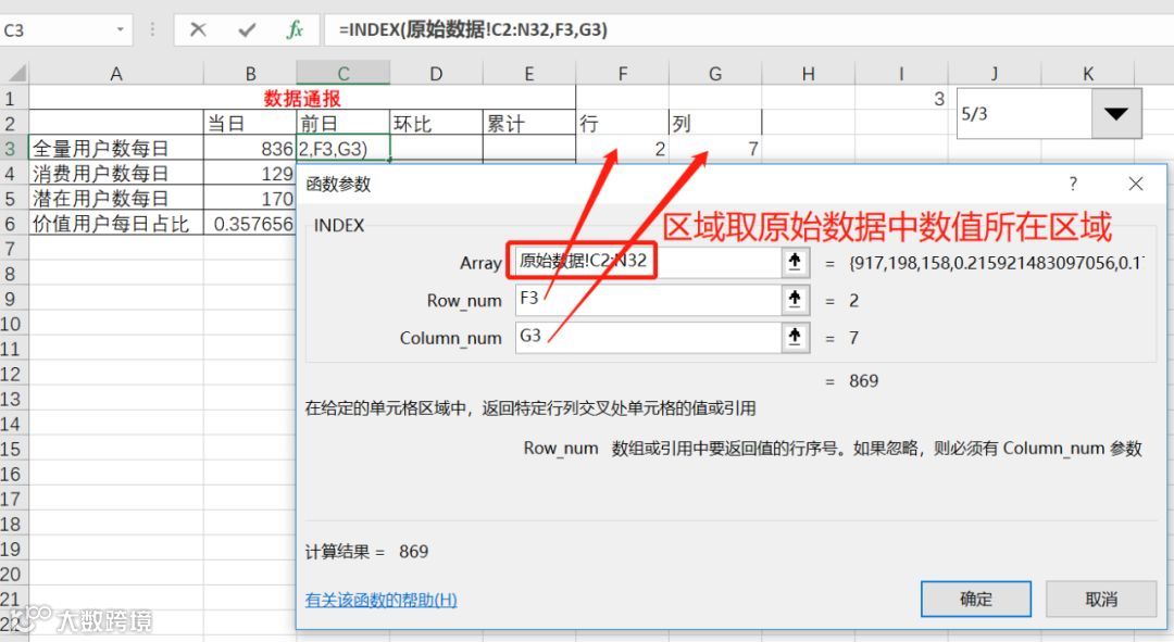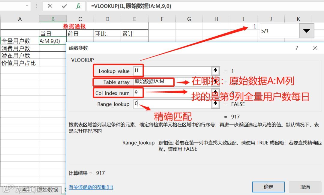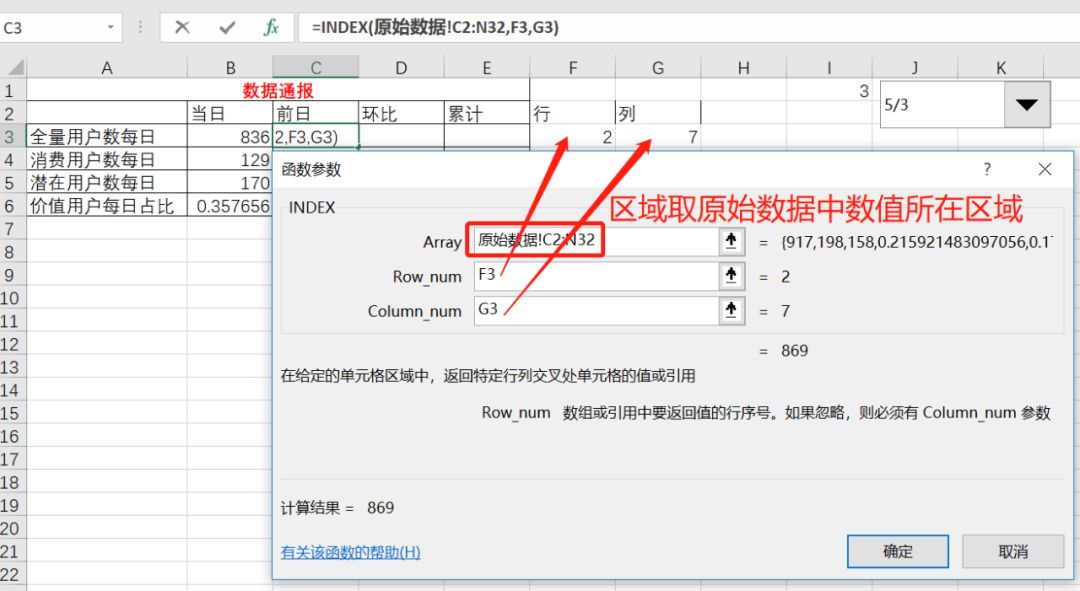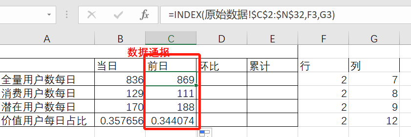 =MATCH(A3,原始数据!C1:I1,0),要找的是A3单元格全量用户数每日这个字段在原始数据表字段行中是第几个。加上绝对引用下拉公式出来了列的坐标。