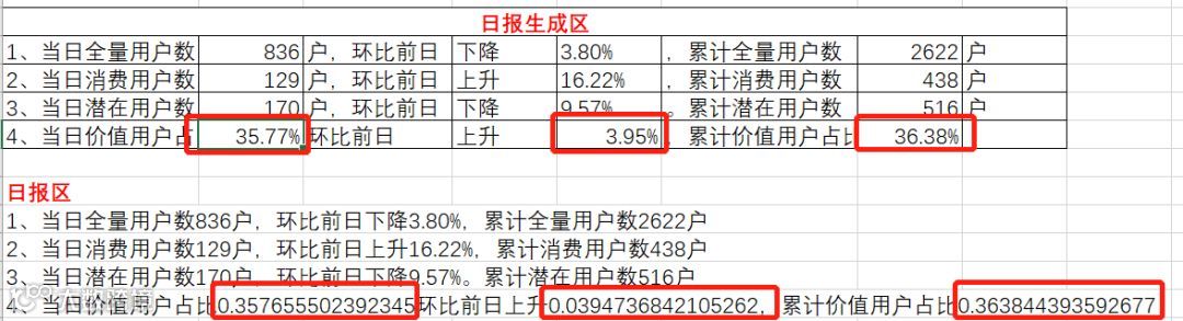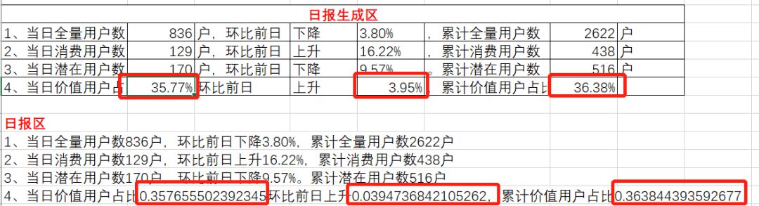 看这里,如果在日报生成区没有用text函数处理数值,在日报区就会出现以下效果,是我们不想要的。