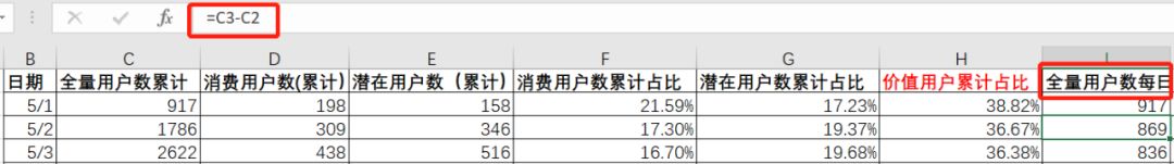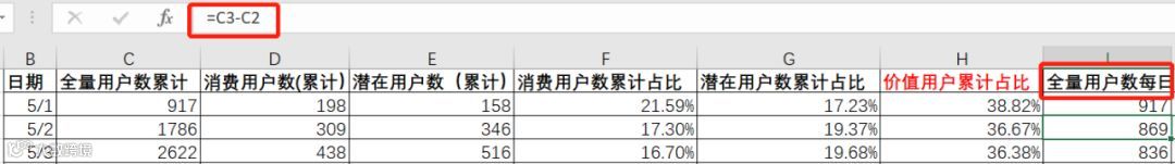 好了,累计的数目全部算好了,下面来算每日的用户数,这个很容易理解,5月2日的全量用户数等于5月2日的累计全量用户数-5月1日的累计全量用户数。
