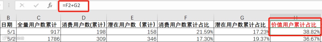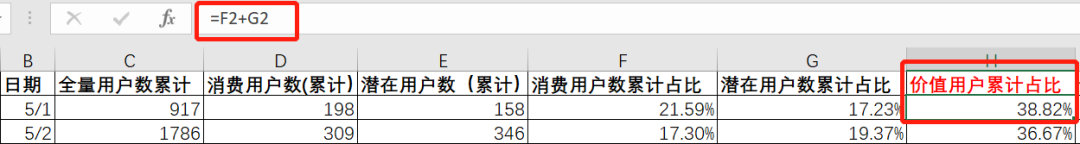还要算出价值用户数累计占比,为消费用户数累计占比加上潜在用户数累计占比