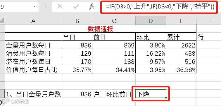 在日报生成区输入生成日报的字符串,其中通过环比来判断上升下降的,应用if嵌套条件判断。=IF(D3>0,"上升",IF(D3<0,"下降","持平"))
