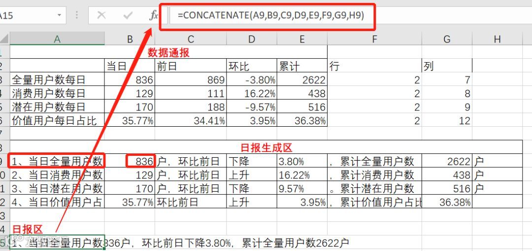 在日报区用concatenate函数连接日报生成区的每一行单元格,连成一句话。