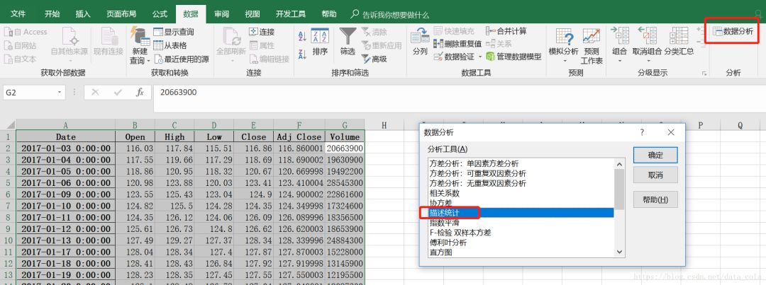 Excel里的分析工具库里的数据分析可以实现描述性统计分析的功能。
