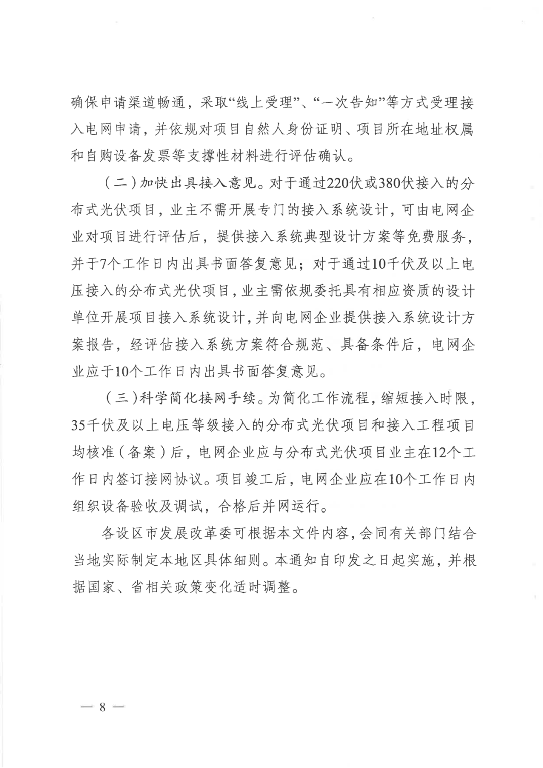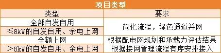 项目类型和不同接网流程要求不变。各设区市发展改革委要将分布式光伏项目接网模式细分为“全部自发自用”、“自发自用、余电上网”、“全额上网”三类,接网要求如下: