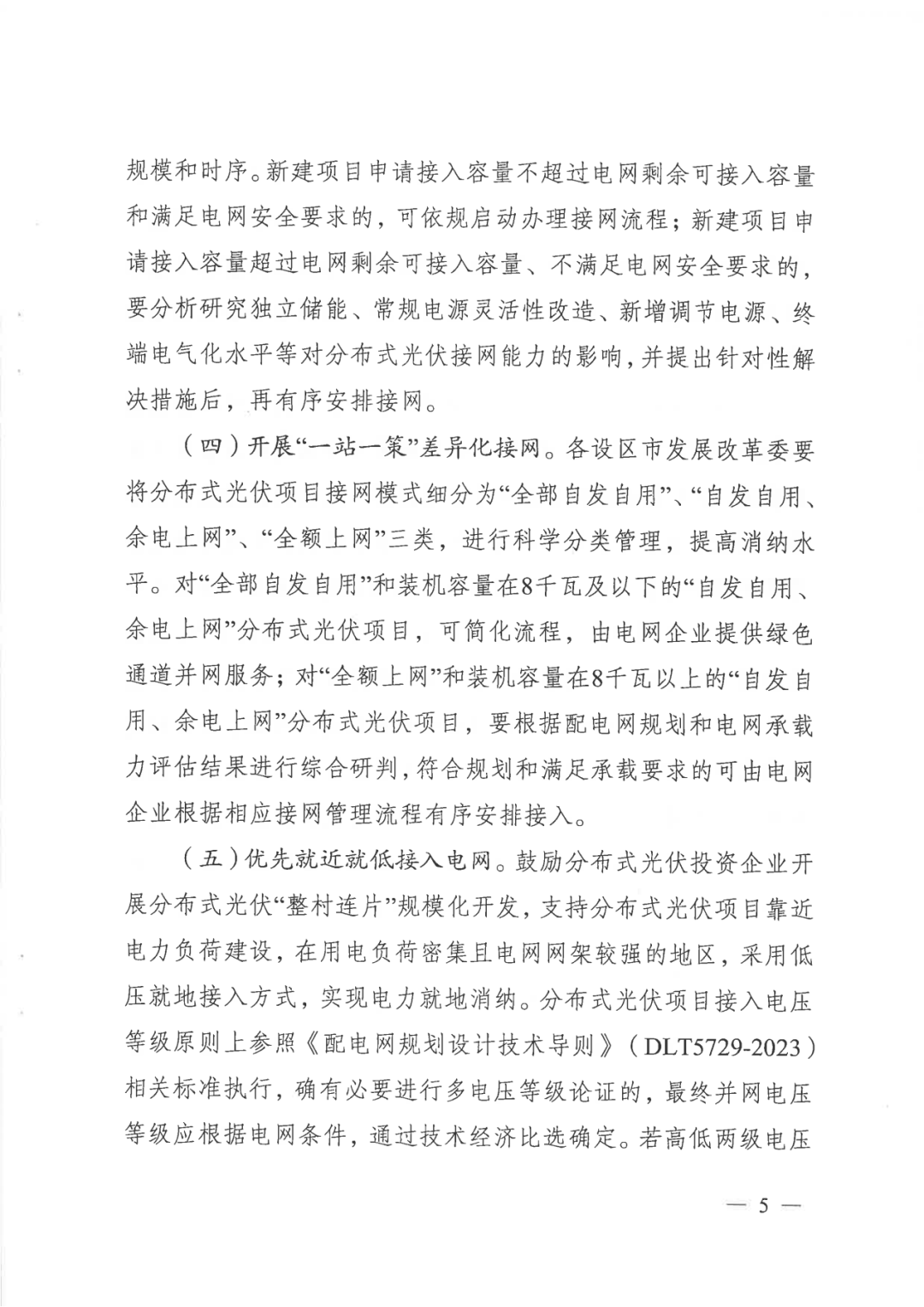 1.仍然支持优先就近就低接入电网。鼓励分布式光伏投资企业开展分布式光伏“整村连片”规模化开发,但在接网等级方面,则从具体的范围划分改为参照《配电网规划设计技术导则》(DLT5729-2023)相关标准执行。