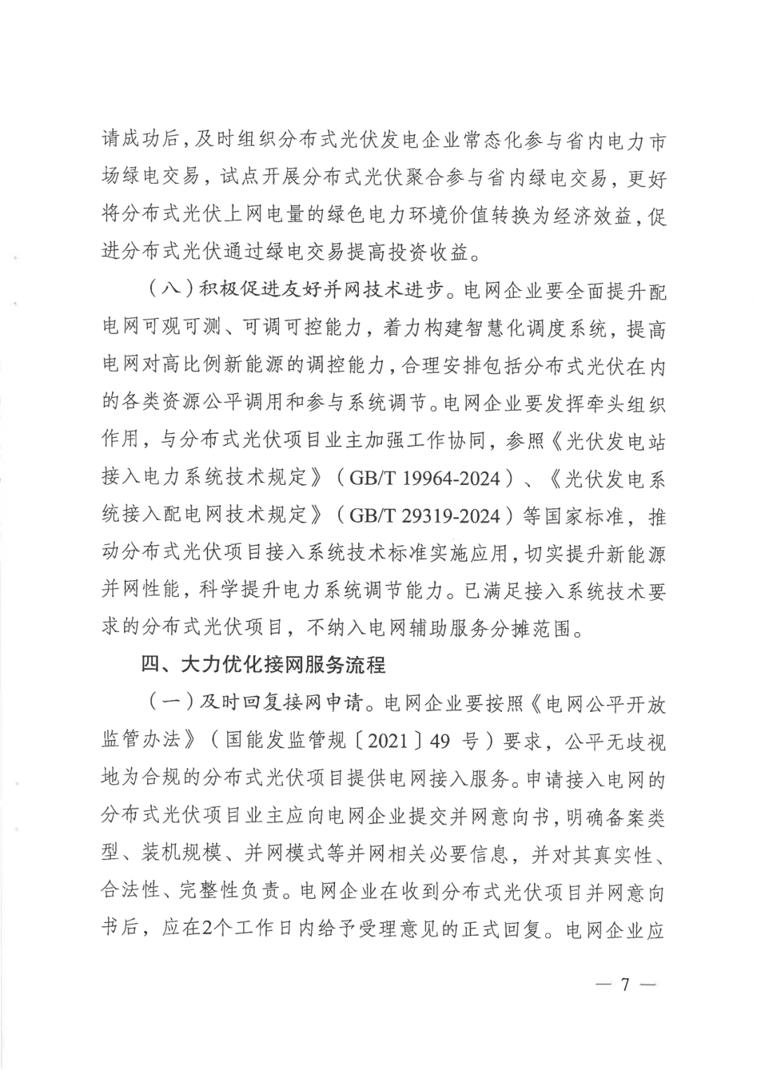 从要求:分布式光伏项目原则上应具备“可观、可测、可调、可控” 功能,在线参与电力系统调节。新建项目满足上述要求的同时,存量项目也需通过技术改造满足相关要求,不能改造的则通过配置新型储能等调峰能力的方式,公平承担电网调峰责任。2025年6月底前仍未满足相关技术要求,分布式光伏将纳入电网辅助服务分摊范围。