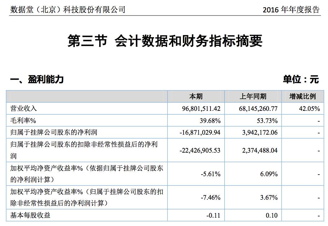 就在今年4月份,数据堂公布了2016年年度财报,归属于挂牌公司股东的净利润是-16,871,029.94,业绩亏损近1700万。