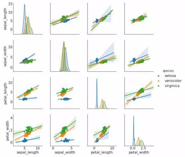 针对每列绘制线性回归线或者,可以在其每列中显示每个组的最佳拟合线。可以通过在 sns.lmplot() 中设置 col=groupingcolumn 参数来实现,如下: