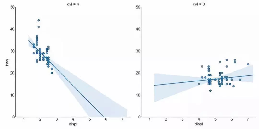 如果你想了解两个变量如何相互改变,那么最佳拟合线就是常用的方法。 下图显示了数据中各组之间最佳拟合线的差异。要禁用分组并仅为整个数据集绘制一条最佳拟合线,请从 sns.lmplot() 调用中删除 hue ='cyl' 参数。