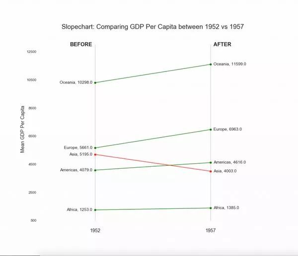 发散型文本(Diverging Texts)与发散型条形图(Diverging Bars)相似,如果你想以一种漂亮和可呈现的方式显示图表中每个项目的价值,就可以使用这种方法。