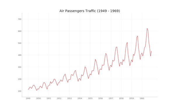 时间序列图用于显示给定度量随时间变化的方式。在这里,您可以看到 1949 年 至 1969 年间航空客运量的变化情况。