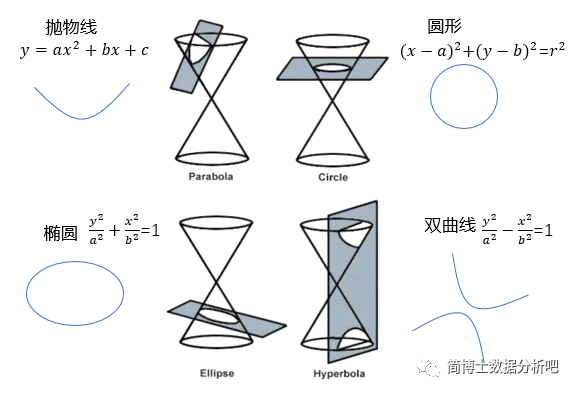 首先,我们先从一个几何图入手。下面这个图代表了一个平面与立体对称圆锥相交的曲线,仔细观察,可以看出,这一系列图形都是二次曲线,即可以用 表示的曲线表达式。