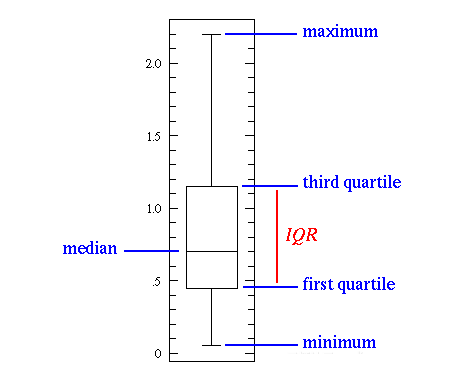 如果中位数接近了底部,那么大部分的数据具有较低的值。如果中位数比较接近顶部,那么大多数的数据具有更高的值。基本上,如果中位线不在框的中间,那么就表明了是偏斜数据; -