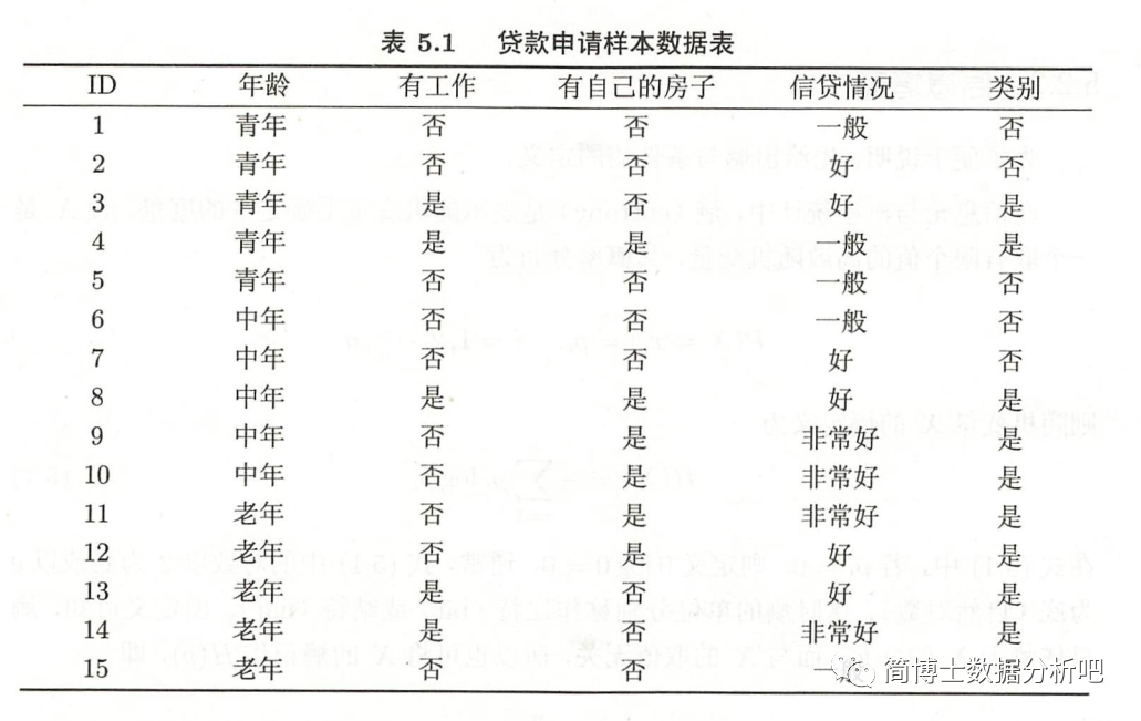 还是上次的例子,训练集 ,特征集分别是 年龄, 是否有工作, 是否有自己的房子, 信贷情况,类别为 =是, =否。