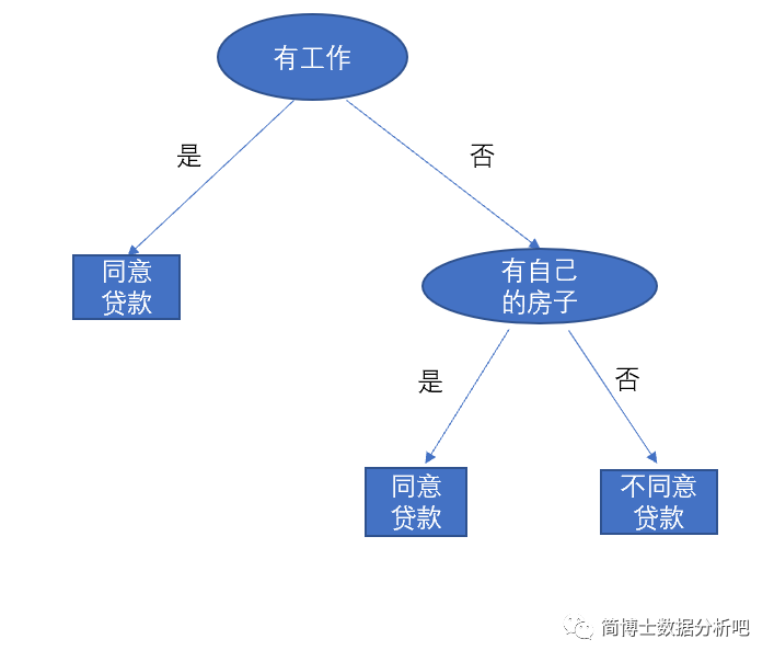 对于这个例子而言,整棵决策树只用了两个特征,因为他们的子集都是属于一个类别的,对于有房子都是同意贷款,对于没有房子的都是不同意贷款,「因此就满足了一开始流程图里的单一叶结点要求,决策树就生成啦!」