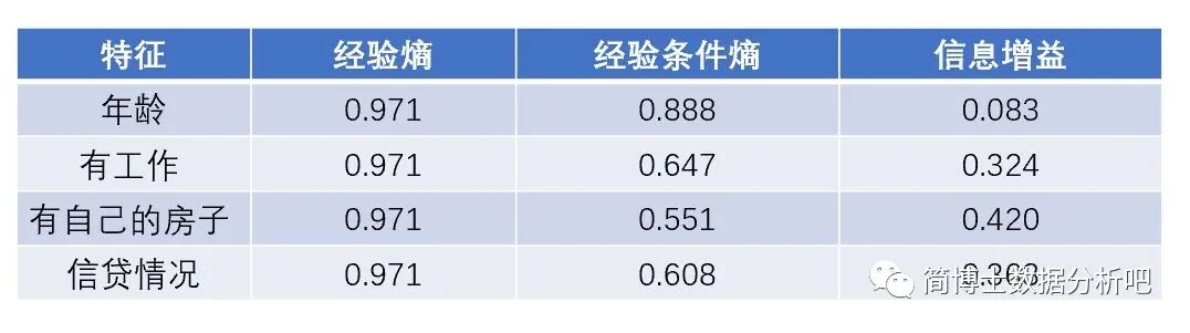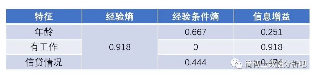接着,把没房子的训练集作为新的训练集 ,把剩下的年龄 、是否有工作 、信贷情况 作为新的特征集,再来计算一下这三个特征下的最大信息增益。