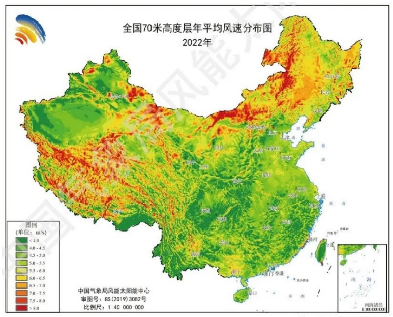 图1:2022年全国70米高度层年平均风速分布图(单位:m/s)