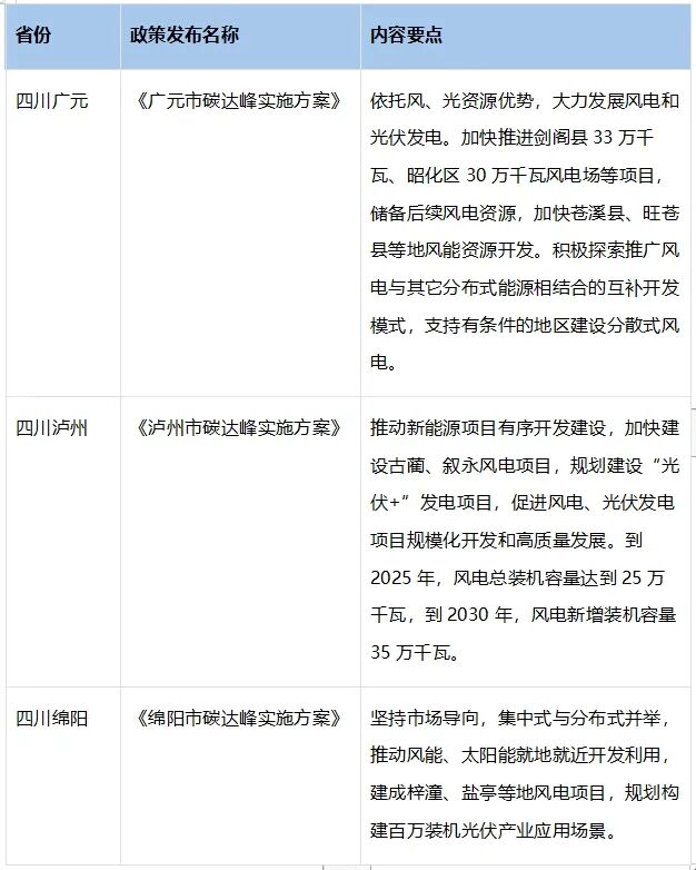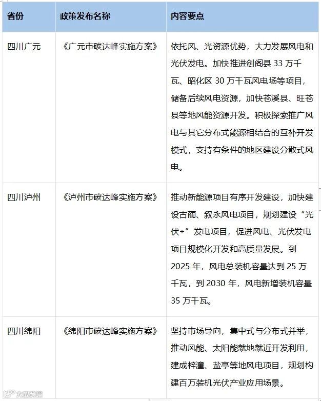 2024年1月,四川省绵阳、广元等地相继出台政策鼓励风电开发,通过税收优惠、财政补贴和土地使用政策,以及简化审批流程等措施积极支持分散式风电的建设,探索风电与其他分布式能源相结合的互补开发模式,此前四川省还在《“十四五”电力发展规划》中提到“十四五”期间,四川省风电总装机容量将达到1000万千瓦。