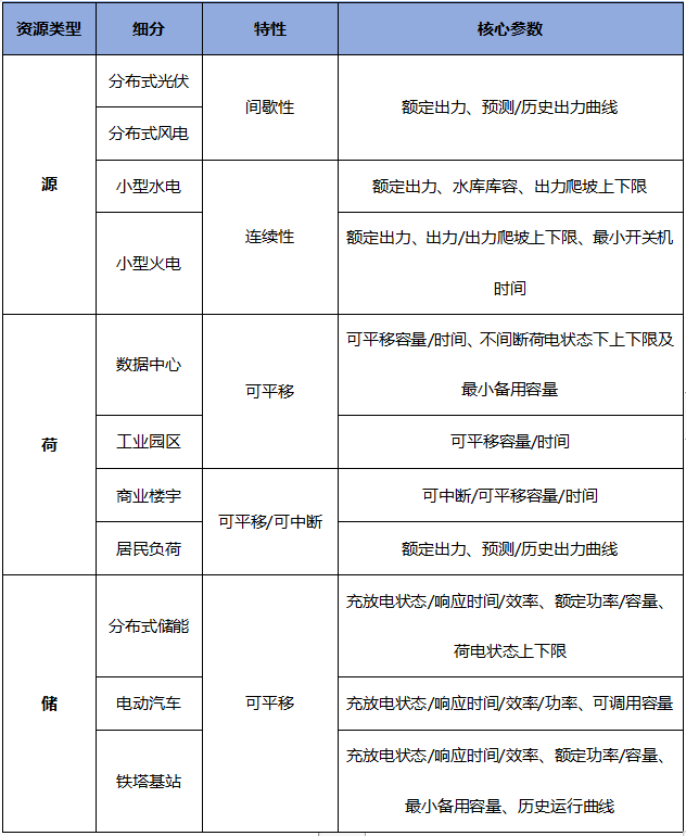 一切在配电层级和可灵活调节自身负荷与出力的资源均可参与虚拟电厂调度,主要分为“源、荷、储”。源类主要有分布式光伏、风电、小型的水电及火电机组等。荷类主要有商业楼宇、工商业园区和冷热负荷,储类主要有独立储能、工商业储能、其他形式储能和电动汽车。