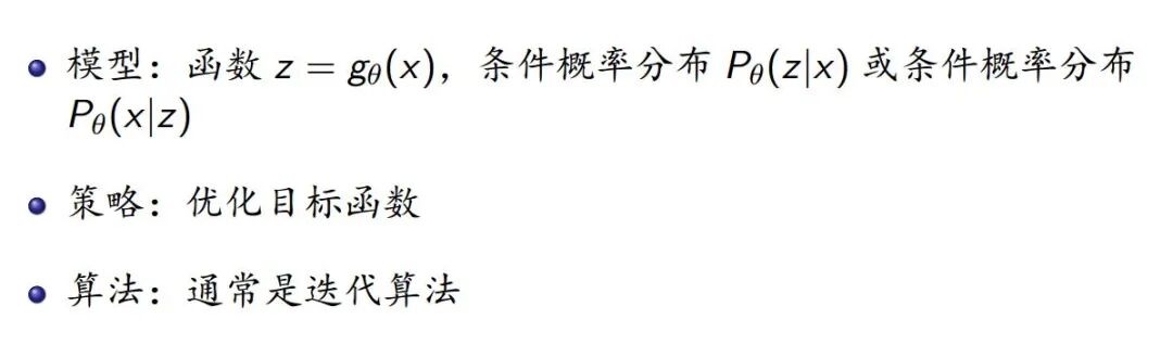 但对于无监督学习,处理的数据是无标注信息的,我们希望找到隐含在数据内部的结构信息,这时候的三要素——模型、策略、算法就不那么具体了。