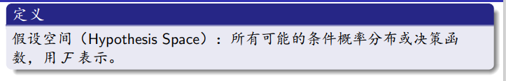 如果模型表示为条件概率分布的形式,那么假设空间就是由所有可能的条件概率分布组成的集合。对于每一个条件概率分布,它由一个参数向量来决定的,所以假设空间也可以说成是由一个参数向量决定的条件概率分布族构成的。此处,所有可能的参数构成参数空间。