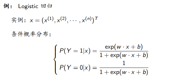 举一个例子,对于Logistic回归,实例、条件概率分布函数如下所示: