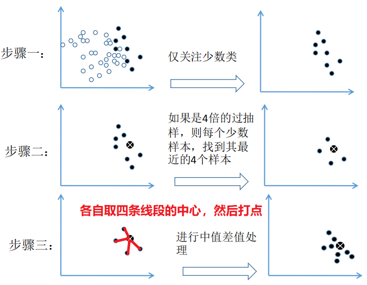 SMOTE 过采样法的出现正好弥补了随机过采样的不足,其核心步骤如下图