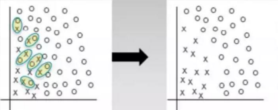 上图为 Tomek Link 欠采样法的核心。不难发现左边的分布中 0-1 两个类别之间并没有明显的分界。Tomek Link 法处理后,将占比多的一方(0),与离它(0)最近的一个少的另一方 (1) 配对,而后将这个配对删去,这样一来便如右边所示构造出了一条明显一些的分界线。所以说欠采样需要在占比少的那一类的数据量比较大的时候使用(大型互联网公司与银行),毕竟一命抵一命...