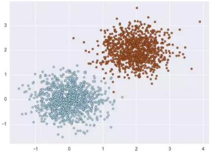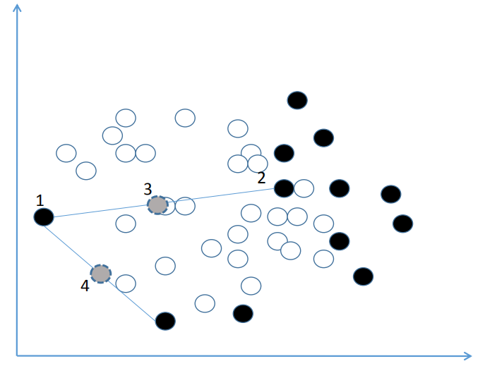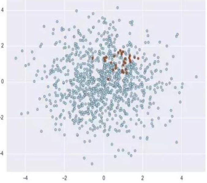 但SMOTE 并不是一点坏处都没有。上图的数据分布 SMOTE 方法的步骤示意图是比较理想的情况(两个类别分得还比较开),通常数据不平衡的散点图应该是像下面这样的: