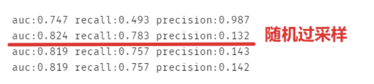 现在对四组数据分别做模型,要注意其实recall和precision的用处都不大,看auc即可,recall:覆盖率,预测出分类为0且正确的,但本来数据集中分类为0的占比本来就很大。而且recall是以阈值为 0.5 来计算的,那我们就可以简单的认为预测的欺诈概率大于0.5就算欺诈了吗?还是说如果他的潜在欺诈概率只要超过 20% 就已经算为欺诈了呢?