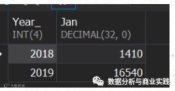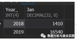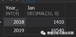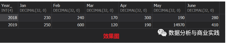 SELECT-- year_-- , month_CASE WHEN year_ = 2018 THEN 2018WHEN year_ = 2019 THEN 2019END AS Year_, SUM(CASE WHEN month_ = 1 THEN amount END) AS Jan, SUM(CASE WHEN month_ = 2 THEN amount END) AS Feb, SUM(CASE WHEN month_ = 3 THEN amount END) AS Mar, SUM(CASE WHEN month_ = 4 THEN amount END) AS Apr, SUM(CASE WHEN month_ = 5 THEN amount END) AS May, SUM(CASE WHEN month_ = 6 THEN amount END) AS June-- , SUM(amount)FROMsalesGROUP BY year_;