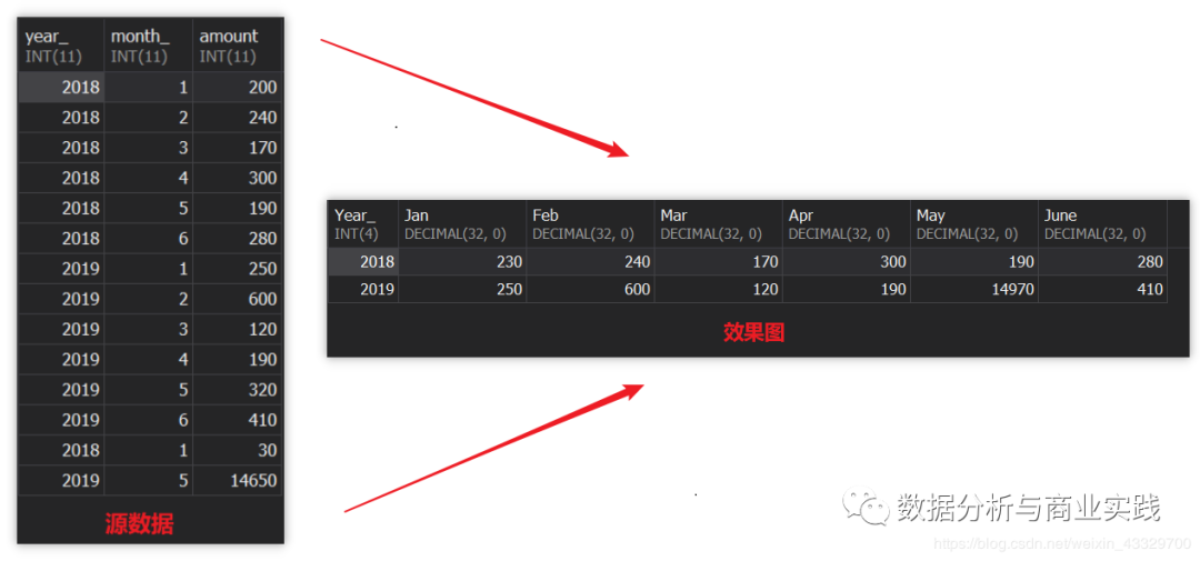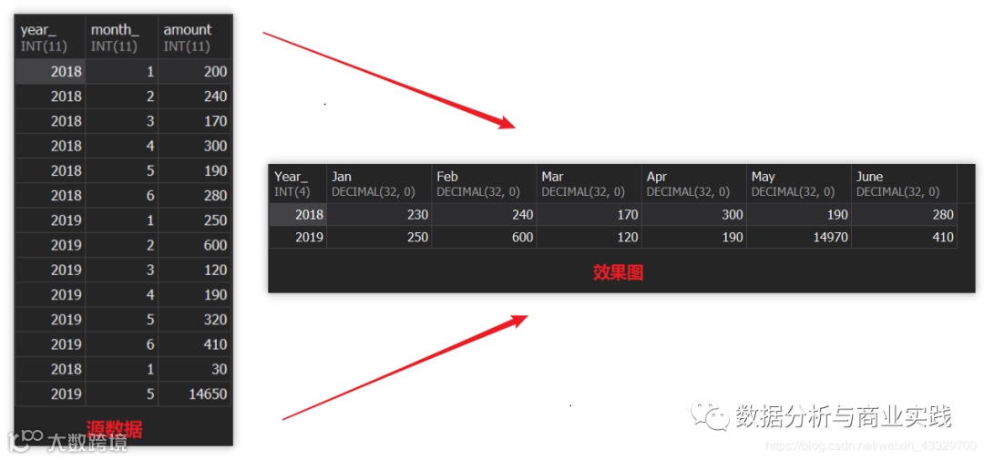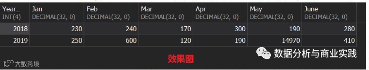 年份分组,对每一年的各月份的零散销量进行汇总统计,行转置成列,打横输出,列名刚好对应月份,十分简洁明了。
