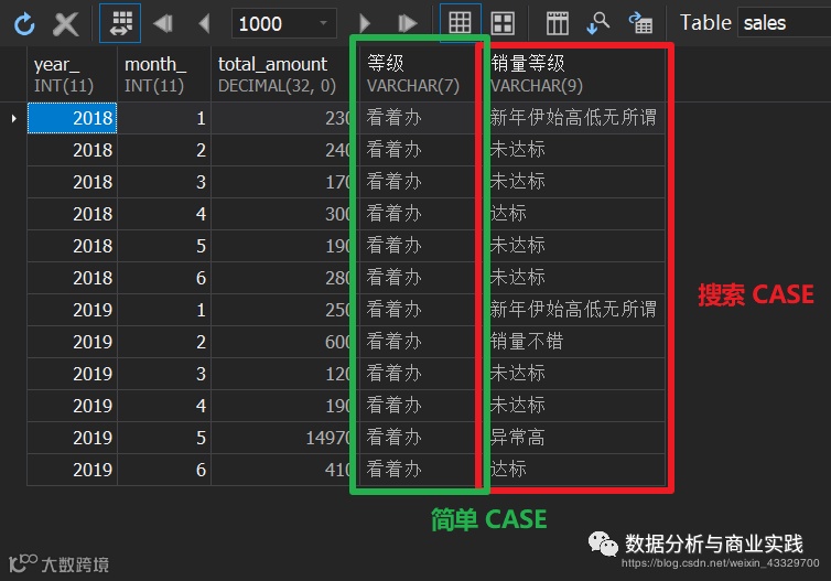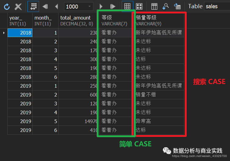 SELECT*-- 简单 CASE, CASE new_table.total_amount -- 只能针对一个条件进行WHEN 1000 THEN '刚好 1000' -- 无法设置区间WHEN 2000 THEN '刚好 2000'ELSE '看着办'END AS '等级'-- ============================-- 方便得多的搜索 CASE, CASE WHEN new_table.total_amount BETWEEN 300 AND 500 THEN '达标'WHEN new_table.total_amount BETWEEN 501 AND 600 THEN '销量不错'WHEN new_table.total_amount > 600 THEN '异常高'-- 搜索CASE 还可以同时加上多种类型的判断条件,即跨列-- 这里垮了 total_amount 和 month 列,简单 CASE 无法实现WHEN new_table.month_ = 1 THEN '新年伊始高低无所谓'ELSE '未达标' -- 销量小于 300 的都算作 ‘未达标’END AS '销量等级'FROM-- 子查询开始(SELECTyear_, month_, SUM(amount) AS total_amountFROMsalesGROUP BY year_, month_) AS new_table-- 子查询结束(养成良好的标记子查询开始与结束的习惯);