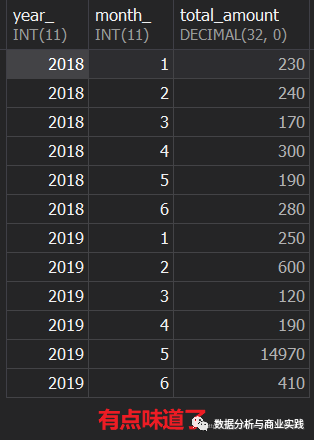 代码阅读顺序拆解:从(FROM) sales 表中读入数据 --> 按照年月分组(每一年有六个月,1:6 的关系) --> 将分组后的内容呈现(SELECT) 出来,形式为 年(year_),月(month_),每个月(month_) 对应的总销量(SUM amount) 的别名(total_amount),