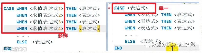 搜索表达式之所以叫 “ 搜索 ”,是因为搜索 CASE 后面的表达式可以完全不同,而简单表达式是 WHEN 后面的表达式可以不同,但 CASE 后面的表达式都是一样的。记住最后都要 END 结尾,格式也建议稍微注意一下,毕竟一大块(所以建议只记搜索表达式)