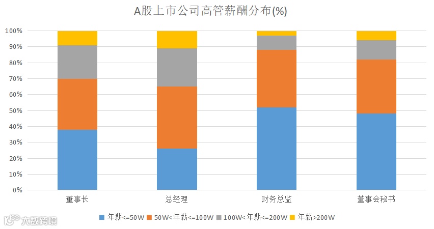 当然成为高管也不是一定能年薪百万的,不同公司、不同职位等级、不同工作内容的高管年收入也是存在着很大的差距的,财务总监和董事会秘书,这两群体百万年薪的人数分别只有13%和17%左右,而相比而言总经理这个级别的人群,百万年薪的则有36%