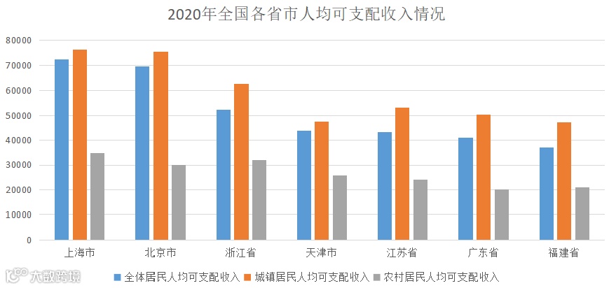 我们还是从数据的维度来看,去年全国31个省份人均的可支配收入,上海的人均可支配收入为72000元左右,和浙江省以及江苏省的人均可支配收入平均到每个月也就是几千块的差距,差的并没有那么的多。