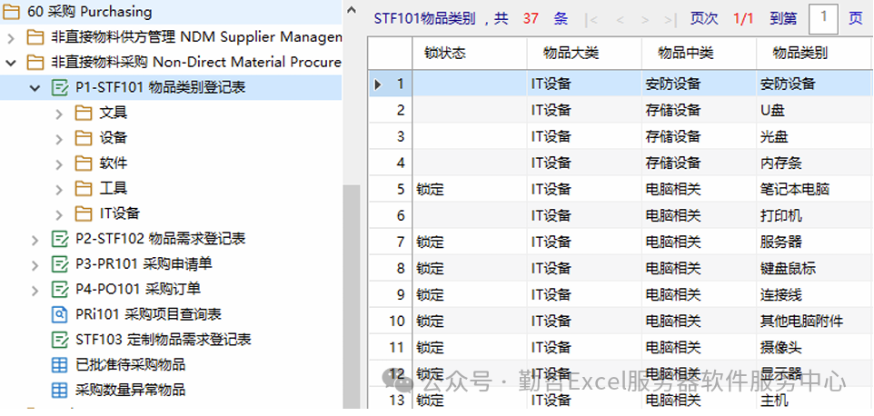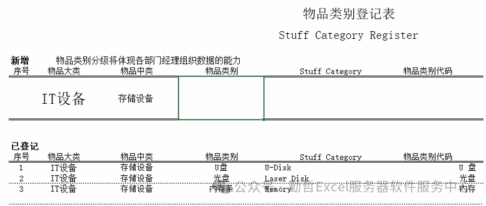 点击新建,开启EXCEL ,选择物品的大中类别(财务科目),下方会显示出已登记过的同类别物品。