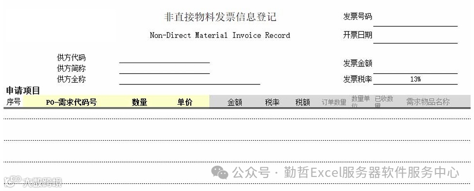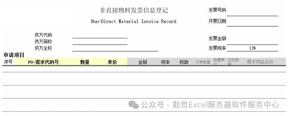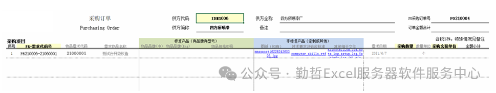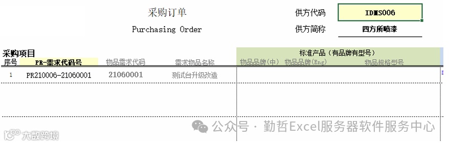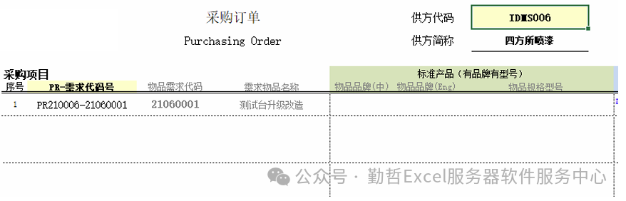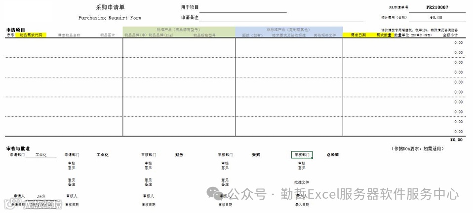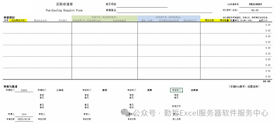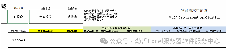 新建一个采购申请,然后在下图界面中,选择和填写3列黄色单元格的内容,之前登记过的物品 信息会自动显示在绿色和蓝色列,不用填写。