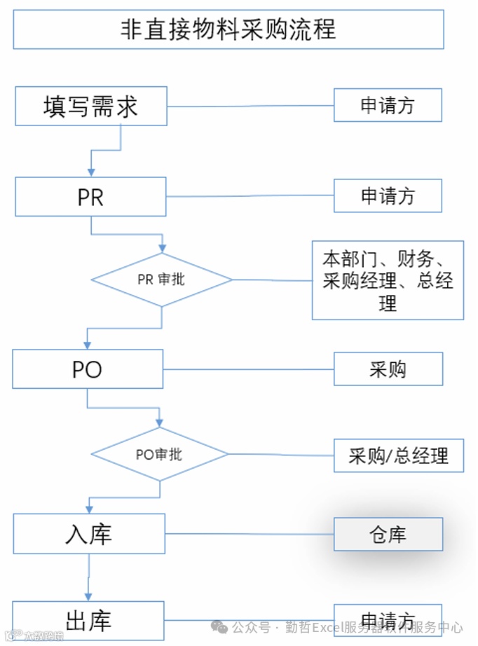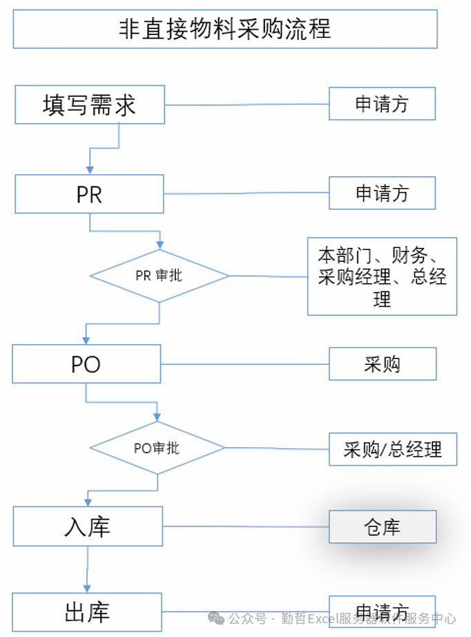 非直接物料的采购流程分采购和付款两个大环节,分别用于满足需求方和供方的诉求。