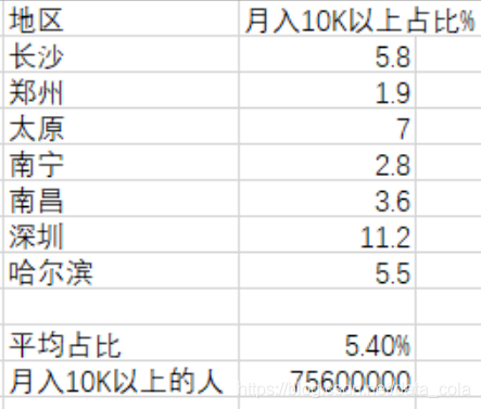 计算得到月收入10K以上的平均占比为5.4%,14亿人*5.4% = 7560万人