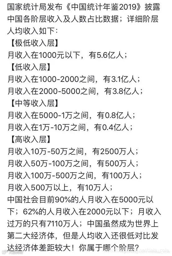 同样先说结论,从官方公布的统计数据来看,月入过万的有7110万人,也就是说,如果你月收入过万,那你就属于top 5%的人群了。