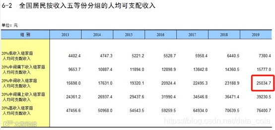 全国居民按收入五等份分组的人均可支配收入,2019年20%中间收入组家庭人均可支配收入是25034.7元/年,平均2086元/月。有40%的家庭处于低收入和中等偏下组别,年平均收入为11578元,月收入约1000元。