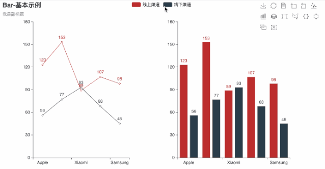 使用者可以自定义结合Line/Bar/Kine/Scatter/EffectScatter/Pie等图表,将不同类型的图表画在一个可视化文件中,但是需要注意的是,第一张图需为X/Y轴的图,即不能为Pie,其他位置顺序随意,例如