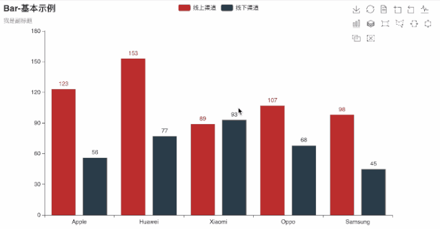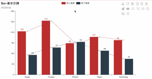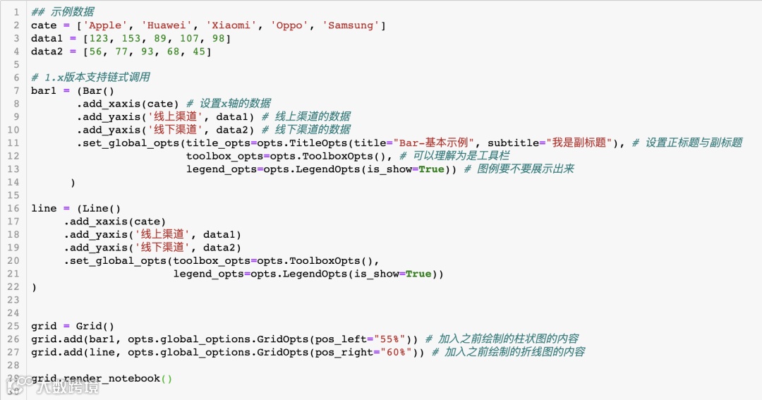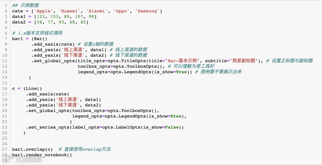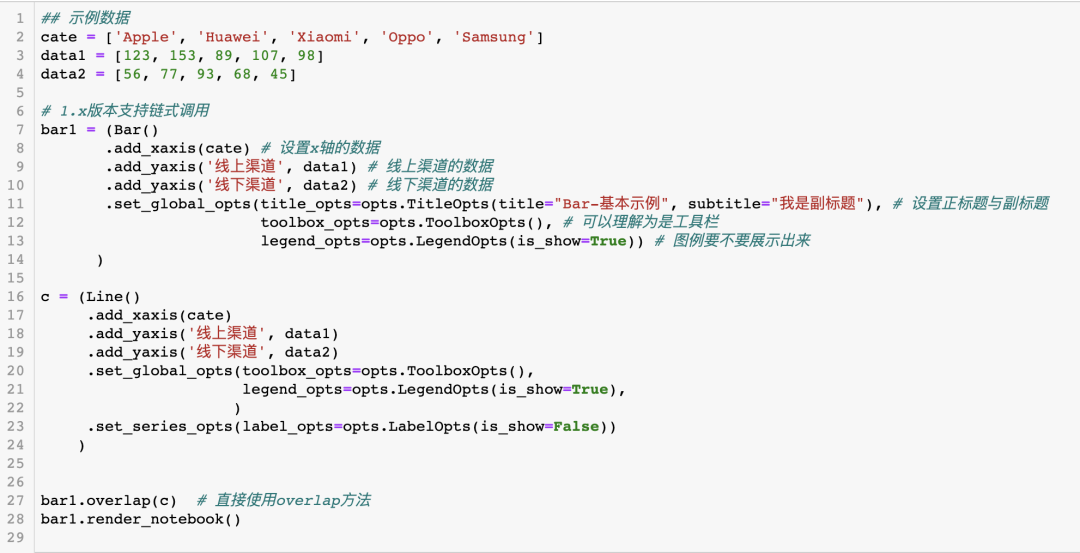 使用者可以自定义结合Line/Bar/Kine/Scatter/EffectScatter/Pie等图表,将不同类型的图表画在一张图上,利用第一个图表为基础,之后的数据都会画在第一个图表之上,而在新版的pyecharts中,直接对图表使用overlap()方法即可