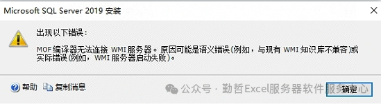 问题:安装SQL Server2019出现以下错误:MOF 编译器无法连接 WMI服务器。原因可能是语义错误(例如,与现有的 WMI知识库不兼容)或实际错误(例如,WMI服务器启动失败)。
